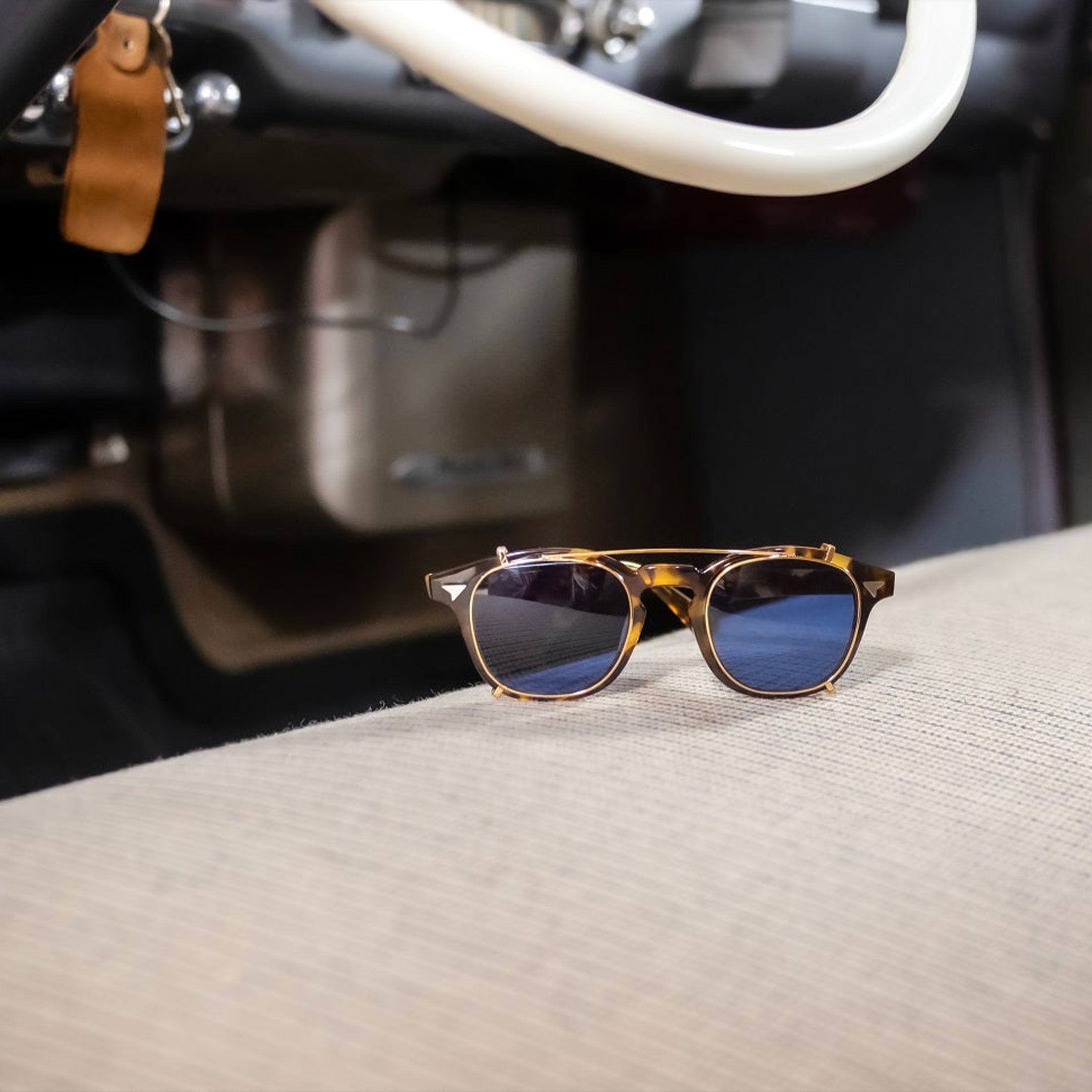 The distinctive glasses in tortoiseshell and piano black acetate feature clip-on sunglasses available in three different colours: Deep Blue, Olive Green, and Sky Blue. James Dean® by Renauld is crafted carefully to exacting standards in the Renauld Studios in Italy and comes with the option of prescription lenses.
